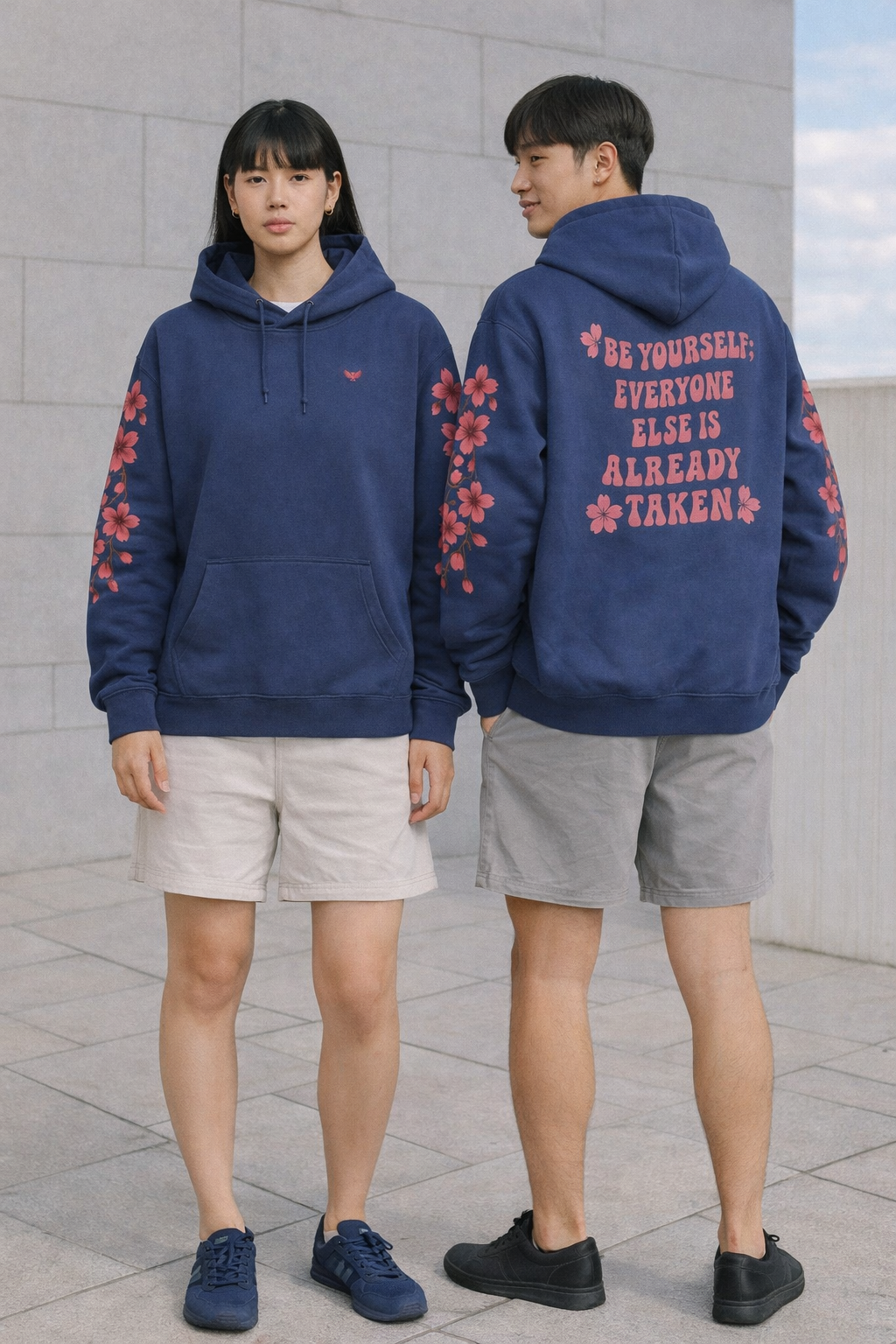 Stop blending in. Deep navy fleece meets vibrant cherry blossom sleeves and a bold reminder on the back: "Be yourself; everyone else is already taken." 🦋